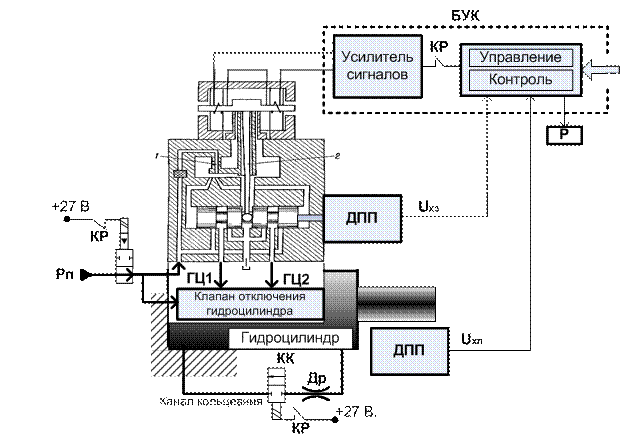 Рис.7.11. Устройство и упрощённая схема контроля типового электрогидравлического усилителя типа «струйная трубка», преобразующего сигналы управления в перемещение золотника. Здесь приняты обозначения: ДПП – датчик перемещения золотника ЭГУ; Рп – давление подачи на входе в ЭГУ; КР – контакты реле блока управления и контроля; Др – демпфирующий дроссель; Uхз – выходной сигнал с датчика положения золотника; Uхп – сигнал позиционной обратной связи привода; 1 – струйная трубка; 2 – струна механической позиционной обратной связи; БУК – блок управления и контроля.