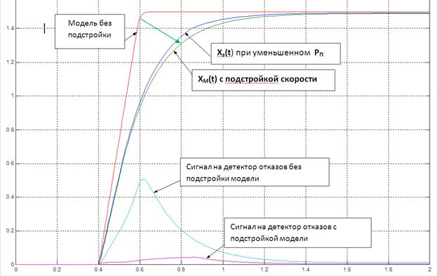 Рис.7.14. Переходные процессы в системе контроля исправности ЭГУ по перемещению золотника ХЗ(t) путём сравнения с выходной координатой цифровой модели ЭГУ - ХМ(t). Приведены кривые переходных процессов в случае модели с подстройкой модели по скорости (см. рис.1.2.5-б) и без подстройки.