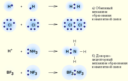 Ковалентная связь – наиболее общий вид химической связи, возникающий за счет обобществления электронной пары посредством обменного механизма, когда каждый из взаимодействующих атомов поставляет по одному электрону, или по донорно-акцепторному механизму, если электронная пара передается в общее пользование одним атомом (донором) другому атому (акцептору) (рис. 3.2).