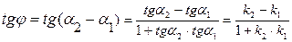 Пусть прямые заданы уравнениями и , - угол между прямыми. Известно, что , и (по теореме о внешнем угле треугольника).