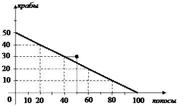 Задача 4. На небольшом острове живут 5 человек. Они собирают кокосы и ловят крабов. В день каждый может собрать 20 кокосов, либо выловить 10 крабов. На острове нет никаких государственных институтов и не действует закон возрастающих альтернативных издержек. 1) Начертите КПВ экономики этого острова. 2) Могут ли островитяне добыть в день 50 кокосов и 30 крабов? 3) На остров завезена техника, в результате применения которой каждый островитянин теперь может собирать 30 кокосов. Как изменилось положение КПВ? Решение: 1. На основании условий задачи строится таблица альтернативных возможностей, затем по точкам строится КПВ.
