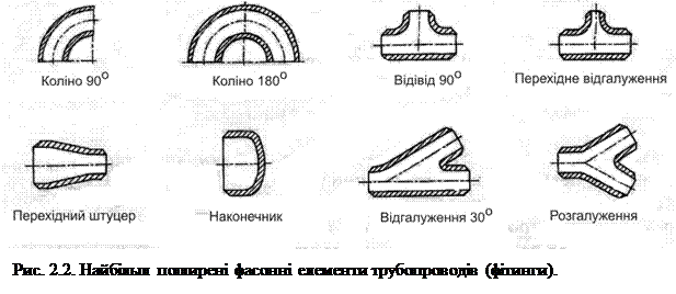 На рис. 2.2 приведені найбільш широковживані фасонні елементи передбачені для монтування трубопроводів зваркою. Зрозуміло, що комплектувати трубопроводи фасонними елементами необхідно з врахуванням умовного проходу та номінального тиску та матеріалу трубопроводу.