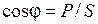 Звернемо увагу, що у трикутнику потужностей, так як і в трикутниках напруг і опорів, кут зсуву фаз j між струмом і напругою кола розташований між активною складовою і повною величиною. Отже, з трикутника потужностей маємо: