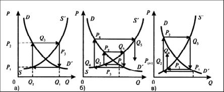 Главным в подходе Л.Вальраса является разница в объеме спроса Q2 – Q1 при цене Р1 (рис.2.15 а), в результате конкуренции покупателей происходит повышение цены до тех пор, пока не исчезает избыток. В случае избытка предложения (при цене Р2) конкуренция продавцов приводит к исчезновению избытка. Главным в подходе А.Маршалла является разность цен Р1–Р2. Он исходит из того, что продавцы прежде всего реагируют на разность цены спроса и цена предложения. Увеличение (уменьшение) объема предложения сокращает эту разность и тем самым способствует достижению равновесной цены (рис. 2.15 б). Короткий период лучше характеризуется моделью Л.Вальраса, длительный — моделью А.Маршалла. Рынок стихийно, автоматически способствует формированию равновесных цен (этот процесс А.Смит назвал механизмом "невидимой руки"). Превышение цены спроса над ценой предложения способствует перераспределению ресурсов в пользу отраслей с высоким платежеспособным спросом. Высокие цены свидетельствуют об относительной редкости благ, побуждая к расширению их производства и тем самым к лучшему удовлетворению общественных потребностей. Поскольку равновесная цена значительно превышает издержки у тех отраслей, затраты которых ниже средних, то она способствует перераспределению ресурсов от худших производителей к лучшим, повышая эффективность функционирования национальной экономики в целом. Ситуацию равновесия, с точки зрения временных характеристик, характеризует паутинообразная модель (рис. 2.16), т.е. срок между изменением цены и связанными с этим переменами в масштабах производства.
