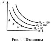 В долгосрочном периоде все факторы становятся переменными в том смысле, что у предпринимателя есть достаточно времени, чтобы изменить их размер (например, построить новый завод, установить новую партию станков). Факторы производства могут быть использованы не только совместно, но и в определенной степени они могут заменять друг друга. Поэтому предпринимателю надлежит выбрать такую технологию, которая позволит минимизировать издержки производства. В простейшей двухресурсной модели рациональный предприниматель будет вести себя аналогично рациональному потребителю и сопоставит предельную отдачу ресурсов (выигрыш) с затратами на их приобретение. Формула минимизации издержек выглядит следующим образом: MPL / PL = MPK / PK Данная формула означает, что отдача на последний рубль (доллар, иену) издержек должна быть одинаковой для каждого ресурса. Если на вложенный рубль предельный продукт труда будет больше, чем предельный продукт капитала, предприниматель будет нанимать больше работников и сократит количество используемого капитала. И наоборот. Подобный вывод может быть получен не только на основе принципов маржинализма, но и путем использования анализа изоквант и изокост. Изоквантой называется геометрическое место точек, соответствующих всем комбинациям двух ресурсов, способным произвести заданный объем продукта. По существу и графически изокванты напоминают кривые безразличия. Действительно, предпринимателю безразлично, какую комбинацию ресурсов применить: А, В или С, поскольку в любом случае будет произведено одно и то же количество товара (рис. 4-4).