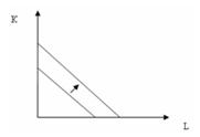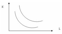 Наклон изокванты характеризует предельную норму трансформации MRT S (предельную норму технологического замещения в производстве) и равен отношению предельных продуктов двух факторов, т.е. равен абсолютному значению углового коэффициента MRT S = MPL/MP K Наклон изокванты в разных ее точках не одинаков. МRТS труда капиталом представляет собой величину, на которую может быть сокращен капитал за счет использования одной дополнительной единицы труда при фиксированном объеме выпуска продукции. Она аналогична предельной норме замещения (МRS), упоминавшейся в теории потребления. Подобно МRS МRТS всегда является положительной величиной. Изоквантные кривые имеют вогнутую форму — МRТS сокращается по мере движения вниз вдоль изокванты. Уменьшение предельной нормы технического замещения говорит о том, что эффективность использования любого производственного фактора ограничена. По мере замещения в производственном процессе капитала большим количеством труда производительность труда снижается. Аналогичным образом, когда труд замещается большим количеством капитала, его отдача снижается. Производству требуется сбалансированное сочетание обоих производственных факторов. МRТS тесно связана с предельными продуктами труда МРL и капитала МРК. Чтобы показать это, представим, что при некотором увеличении трудозатрат и сокращении используемого количества капитала объем выпуска продукции остается постоянным. Прирост выпуска продукции в результате увеличения затрат труда равен величине дополнительного выпуска продукции, приходящегося на дополнительную единицу труда (предельному продукту труда), помноженной на количество дополнительных единиц труда. Объем дополнительного выпуска в результате увеличения трудозатрат = (МРL) (ΔL). Аналогичным образом снижение выпуска продукции в результате сокращения используемого капитала представляет собой сокращение объема выпуска в результате сокращения капитала на единицу (предельный продукт капитала), помноженный на число сокращенных единиц капитала; сокращение выпуска в результате уменьшения капитала = (МРк)· (Δ К). Так как мы сохраняем объем выпуска продукции постоянным для всей изокванты, изменение объема выпуска продукции равно нулю. Таким образом, выполняется следующее равенство: (МРL)*(ΔL) + (МРк)*(Δ К) = 0. Теперь, меняя условия, мы можем получить: (МРL)· (МРК) = - (Δ К/ Δ К) = МRТS. Кроме того, равновесие производителя в долгосрочном периоде дополняется равенством: МРК/ МРL = РК/ РL. Таким образом, условие максимизации выпуска будет дополняться значением цен на ресурсы. Причем ценой ресурса труд является заработная плата (РL=w), а ценой ресурса капитал – процентная ставка (РК = r).
