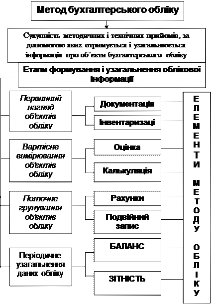 Сукупність способів відображення господарських операцій в бухгалтерському обліку визначає метод бухгалтерського обліку. Метод бухгалтерського обліку — це система засобів, що забезпечують суцільне, безперервне і взаємопов'язане відображення об'єктів бухгалтерського обліку з метою використання інформації про їх наявність та зміни для прийняття економічних рішень у процесі управління підприємством. Окремі прийоми обліку, що використовуються для відображення об'єктів, називається елементами методу бухгалтерського обліку. До елементів методу відносяться: —документування; —інвентаризація; —оцінка; —калькулювання; —рахунки; —подвійний запис; —баланс; —звітність. Документування — це спосіб первинної реєстрації фактів господарської діяльності для безперервного їх відображення в поточному обліку. Усі господарські операції, що відбулись на підприємстві, обов'язково підлягають відображенню у первинних документах, оскільки лише на підставі відповідним чином заповнених первинних документів здійснюється подальша обробка і групування інформації, її відображення у фінансовій звітності. Інвентаризація — це зіставлення фактичної наявності майна та зобов'язань з інформацією про них, відображеною в облікових записах. Оцінка — це спосіб грошового вимірювання господарських засобів, зобов'язань та господарських операцій. Грошова оцінка використовується для узагальнення інформації про господарські операції, наявність активів та зобов'язань в облікових книгах та у фінансовій звітності. Калькулювання — це спосіб визначення фактичної собівартості продукції, товарів, робіт, послуг. На підприємстві визначаються усі витрати, безпосередньо пов'язані з виготовленням певних виробів (робіт, послуг) за їх видами, або з їх придбанням. Деталізовані види витрат в обліку відображаються окремими статтями витрат. При калькулюванні визначається, що саме віднесено на витрати з виготовлення конкретного об'єкта обліку витрат чи його придбання. Бухгалтерський рахунок — це спосіб групування і поточного обліку наявності та змін активів, зобов'язань, капіталу, доходів і витрат. Кожна господарська операція, відображена в первинному документі, знаходить своє відображення на рахунках. Використання рахунків дозволяє групувати інформацію, відображену у первинних документах за економічно однорідними ознаками з тим, щоб у кінці звітного періоду відобразити її у фінансовій звітності. Кожна господарська операція відображається одночасно на двох взаємопов'язаних рахунках у рівновеликих сумах. Це обумовлено використанням способу подвійного запису, за яким кожна операція записується двічі: за дебетом і кредитом різних рахунків. Подвійний запис має важливе контрольне значення. По-перше, отримуючи активи, ми одночасно відображаємо борги по сплаті за них, нараховуючи витрати без визнання активу, ми відображаємо зростання зобов'язань. Виникнення одної господарської операції породжує наслідки, які також відображаються в системі бухгалтерського обліку і часто обумовлюють виникнення інших операцій. По-друге, відображаючи операції за дебетом і кредитом в однаковій сумі, ми повинні отримати рівні підсумки за лівою і правою частиною всіх рахунків підприємства. Якщо така рівність не виконується, це свідчить про допущення помилки при здійсненн