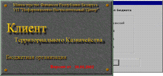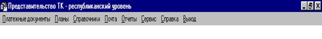 После этого на экране пользователь увидит меню данной задачи: 4. Меню задачи Меню включает следующие функции: «Платежные документы» - платежные документы; - возвраты; - исправительные проводки; - финансирование, взаимозачеты; - платежные документы от Бухгалтерии; «Планы» - планы, остатки, финансирование; «Справочники» - бюджетные организации; - поставщики; - главы; - разделы, подразделы; - статьи, подстатьи, элементы; - банки; - программы, подпрограммы; - коды платежей в бюджет; «Почта» - просмотр почтовых директориев; - принять; - запуск командного файла приема почты; - принять из почтового директория; - повторный прием почты из архива; - выгрузить в почтовый директорий с подписью; - выгрузить в почтовый директорий без подписи; - повторная выгрузка почты из архива в почтовый директорий(без подписи); - подписать; - запуск командного файла отправки почты; - прием почты от бухгалтерии; - подготовка запросов; - просмотр реестра запросов; «Отчеты» - выписка со счета; - отчет о финансировании; - карточка учета ассигнований; «Сервис» - установка даты; - страховое копирование базы данных; - восстановление базы данных из архива; - настройка на объект; - очистка базы данных; - проверка корректности базы; - изменение типа бюджета; «Справка»; «Выход». Активизировать меню можно с помощью клавиши «F10» или нажатием мыши на выбранной опции.