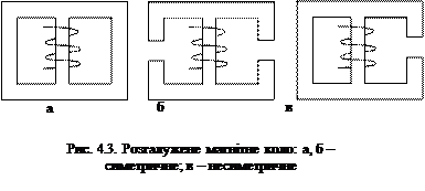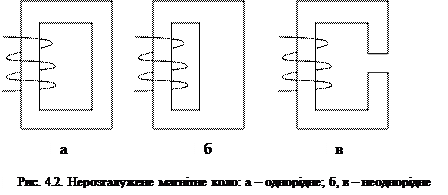 Магнітні кола й їх класифікація Магнітним колом називають сукупність джерел МРС і феромагнітних та інших матеріалів і середовищ, по яких замикається магнітний потік. Джерелом МРС у магнітному колі може бути одна чи кілька котушок, або ж постійний магніт. Шлях, по якому замикаються силові лінії магнітного потоку, або іншими словами магнітопровід, в більшості випадків виконують з феромагнітних матеріалів необхідної конфігурації. Часто магнітопровід електротехнічних пристроїв, окрім феромагнітного матеріалу, включає у себе ділянки виконані з не феромагнітних матеріалів, наприклад повітряні зазори. Феромагнітний матеріал при цьому використовується для направлення і концентрації силових ліній в місці, де безпосередньо використовується енергія магнітного поля, наприклад у повітряний зазор між ротором і статором електричної машини. До однорідних відносять кола, в яких напруженість магнітного поля по всій довжині магнітопроводу є величиною сталою (рис. 4.2, а). Таким чином, достатньо змінити переріз (рис. 4.2, б) або ж матеріал (рис. 4.2, в) будь-якої з ділянок однорідного кола і воно вже буде неоднорідним.