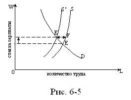 Крупные профсоюзы, предъявляющие ряд экономических требований к работодателям, участвующие в определении условий труда и отдыха на предприятии, в определении ставок заработной платы, безусловно, создают специфическую ситуацию на рынке труда данной отрасли. Существуют три основных способа, с помощью которых профсоюзы пытаются повысить заработную плату. 1) Ограничение предложения труда. Это достигается введением миграционных барьеров, выступлением профсоюзов за законодательство, ограничивающее максимальную продолжительность рабочего дня. Если профсоюз имеет узкую специализацию и добивается того, чтобы на работу принимали только членов профсоюза, то ограничение предложения может быть достигнуто за счет высоких вступительных взносов для членов данного профсоюза, установления продолжительного срока при использовании учеников, прямым отказом от приема новых членов в данный профсоюз. Результат ограничения предложения труда может быть проиллюстрирован в виде графика: