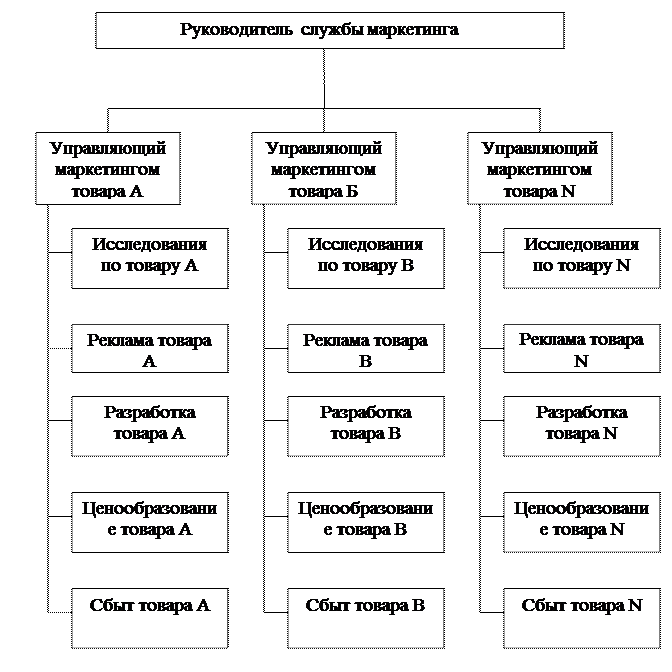 Товарная структура (рис. 8.3.) используется фирмами с широкой номенклатурой продукции. При этом функциональные обязанности по всем элементам маркетинга по каждому из товаров (товарной группе) закрепляются за соответствующим подразделением службы маркетинга фирмы. Данная структура службы маркетинга имеет ряд преимуществ. Управляющий маркетингом соответствующего товара координирует весь комплекс маркетинга по этому товару и быстрее реагирует на возникающие на рынке проблемы. Благодаря быстрой адаптации товарной политики к требованиям рынка данная структура является эффективным средством конкурентной борьбы. Товарная структура особенно эффективна, когда требования к упаковке, сбыту, рекламе по каждому выпускаемому товару значительно отличаются друг от друга, а объем сбыта по каждому товару (товарной группе) достаточен для покрытия расходов на маркетинг по данному товару (товарной группе). К недостаткам данной структуры относятся: дублирование функций маркетинга, что увеличивает общие затраты по фирме на маркетинг, несколько меньшая возможность интеграции маркетинга в производственную сферу фирмы, выполнение сотрудниками данных служб нескольких маркетинговых функций (сбыт, реклама, планирование товара и т. п.) зачастую препятствует росту их квалификации. Рис. 8.3. Товарная структура службы маркетинга