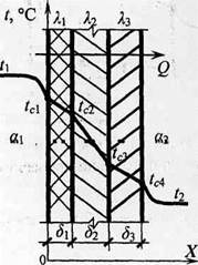 В случае передачи теплоты через многослойную плоскую стенку (рис. 2.52) в знаменателе формулы (2.194) нужно поставить сумму термических сопротивлений всех слоев