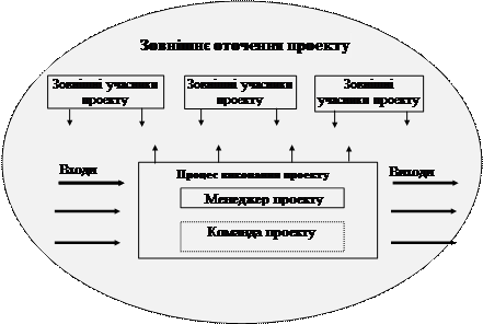 Рис. 1. Загальна схема проекту [2] Найпоширеніша класифікація проектів представлена в таблиці 1. [2]. Проекти, реалізовані в різних областях, різними фахівцями мають значні розходження між собою. Тому для вибору того або іншого підходу до управління конкретним проектом попередньо необхідно розібратися з особливостями саме даного типу або виду проекту.