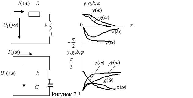 Таким образом, вещественная частотная характеристика цепи представляет собой вещественную часть комплекса полной входной проводимости, заданную во всем диапазоне частот, а мнимая частотная характеристика – мнимую часть. Экспериментально частотную характеристику следует снимать с помощью генератора синусоидальных напряжений переменной частоты при изменении последней от нуля до такого предела, при котором прекращается изменение характеристики или она становится ничтожно малой по сравнению с ее начальным значением. На рисунке 7.3 приведены простые двухполюсники и соответствующий им ряд частотных характеристик