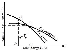 Відповідно до цієї схеми вище температури ТS речовина повинне перебувати в рідкому стані, а нижче ТS – у твердому. При температурі рівної ТS рідка і тверда фаза мають однакову енергію, метал в обох станах перебуває в рівновазі, тому дві фази можуть існувати одночасно нескінченно довго. Температура ТS – рівноважна або теоретична температура кристалізації. Для початку процесу кристалізації необхідно, щоб процес був термодинамічно вигідний системі й супроводжувався зменшенням вільної енергії системи. Це можливо при охолодженні рідини нижче температури ТS. Температура, при якій практично починається кристалізація називається фактичною температурою кристалізації (дійсною температурою). Охолодження рідини нижче рівноважної температури кристалізації називається переохолодженням, що характеризується ступенем переохолодження (∆Т):