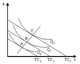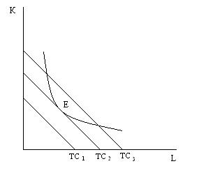Если задана величина издержек и требуется в пределах заданного бюджета получить максимум продукции, то это достигается в точке Е – точке касания изоксты и изокванты Q2 (рис.18.).