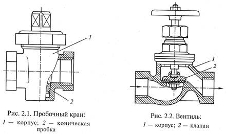 Для полного или частичного перекрытия трубопровода с целью регулирования количества протекающей среды они снабжены затворно-регулирующей арматурой, к которой относятся краны, вентили и задвижки. Кран (рис. 2.1) состоит из корпуса 1, в котором вращается коническая пробка 2 со сквозным отверстием. Краны имеют простое устройство, низкое гидравлическое сопротивление, однако большая поверхность трения может привести к их заеданию, потери герметичности. Их изготавливают из чугуна, керамики, бронзы, пластмасс, стекла, применяют для трубопроводов небольшого диаметра при температурах до 100°С и давлении до 0,1 МПа, когда не требуется точного регулирования, так как небольшой поворот пробки вызывает значительное изменение площади проходного сечения крана. Вентиль (рис. 2.2) используется практически для тех же условий, что и кран, и представляет собой корпус 1 с отверстием, над которым расположен клапан 2, совершающий возвратно-поступательное движение. При закрытии вентиля клапан плотно прилегает к отверстию, при открывании – отходит, образуя канал для прохода среды. Вентили имеют больший, чем краны, вес, более сложное устройство и более высокое гидравлическое сопротивление. В то же время они более надежны, и точность регулирования расхода у них выше. Задвижка (рис. 2.3) включает корпус 1 и затвор 2, имеющий форму клина (или выполненный из двух распираемых клином дисков), движущийся перпендикулярно направлению движения жидкости в корпусе задвижки, изменяя сечение прохода. Задвижки обладают малым гидравлическим сопротивлением, просты в эксплуатации, устанавливаются на трубопроводы с диаметром до 1,5 м при давлениях до 10 МПа, однако громоздки и дороги. Классификация гидравлических машин Движущей силой, обеспечивающей перемещение жидкостей, является перепад давлений, создаваемый специальными гидравлическими машинами, которые можно разделить на четыре большие группы: · динамические (центробежные, осевые, вихревые и др.), в которых механическая энергия вращающихся лопаток воздействует на незамкнутый объем жидкости, перемещаемый от входа в насос до выхода из него; · объемные (поршневые, пластинчатые, шестеренные, винтовые и др.), в которых жидкость периодически всасывается и вытесняется из замкнутого объема твердыми телами; · струйные (эжекторы, инжекторы), в которых движение потока жидкости создается струями газа (пара), воды; · пневматические (эрлифты*, газлифты, пневматические подъемники (монтежю) и др.), движение жидкости в которых создается давлением газа. К основным параметрам, характеризующим работу гидравлических машин относятся: · подача – количество среды, перемещаемое машиной в единицу времени. Различают объемную подачу (Q, м3/с) и массовую подачу (G = ρ* Q, кг/с);
