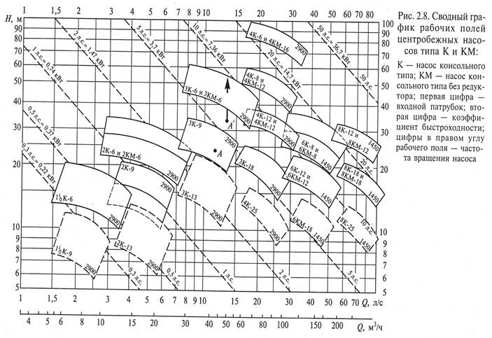 В практической деятельности при выборе технологического оборудования для конкретного процесса, часто возникает задача подбора насосного оборудования. При этом основными параметрами, определяющими выбор конкретного насоса, являются его подача и напор. Количество перекачиваемой жидкости определяется из технологических требований, когда известно, сколько продукта должно быть перемещено из одного аппарата с внутренним давлением Р1 в другой аппарат с давлением Р2. Параметрами, определяющими тип выбираемого насоса, будут являться также физические свойства перекачиваемой среды, ее температура и агрессивность, учитываемые при назначении конструкционного материала. При выборе насоса с требуемым напором следует также учитывать гидравлическое сопротивление системы (включающей расширения, сужения, повороты, запорную арматуру), по которой перекачивается жидкость. После определения величин подачи и напора, а также типа насоса и его исполнения осуществляют его подбор по каталогам, используя карты рабочих полей, на которых нанесены области применения насосов различных типоразмеров (рис. 2.8). Если точка А, соответствующая требуемым значением подачи и напора, попадает в область его применения, соответствующий насос может быть использован в заданном процессе. Если же рабочая точка А' не лежит на рабочей характеристике серийного выпускаемого насоса, выбирают ближайший насос с большими типоразмерами, который либо используют в выпускаемом виде, либо осуществляется операция подрезки рабочего колеса, изменяющая его эксплуатационные характеристики.