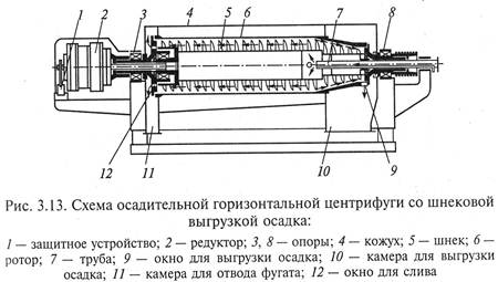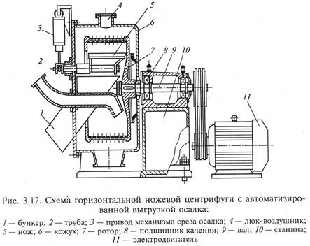 отверстие в днище 12 или через верхнее отверстие 14 ротора, что требует использования ручного труда. Горизонтальные фильтрующие ножевые центрифуги с автоматической выгрузкой осадка (рис. 3.12) предназначены для разделения суспензий со средне- и мелкозернистой (размер частиц более 30 мкм) твердой фазой. Осадительные центрифуги этого типа предназначены преимущественно для разделения плохо фильтрующихся суспензий с нерастворимой твердой фазой (размер частиц 5...40 мкм). Общим конструктивным признаком центрифуг является горизонтальное расположение оси ротора 7, вал 9 которого вращается в подшипниках качения 8, установленных в станине 10. Вращение валу 9 передается от электродвигателя 11. На передней крышке центрифуги смонтированы: привод механизма среза осадка 3 с ножом 5, разгрузочный бункер 1, питающая труба 2. В кожухе 6 центрифуги предусмотрен люк для доступа к ротору при замене или ремонте фильтрующих центрифуги люк-воздушник 4 для отвода паров и газов из внутренней полости кожуха. Осадительные горизонтальные центрифуги со шнековой выгрузкой осадка непрерывного действия (рис. 3.13) предназначены для разделения суспензий с твердой фазой и объемной концентрацией 1...40 %, размером частиц свыше 5 мкм и широко применяются для очистки сточных вод от твердых частиц в природоохранных целях. Основной частью центрифуги является горизонтально расположенный цилиндроконический ротор 6 с соосно расположенным внутри него шнеком 5. Ротор и шнек вращаются в одном