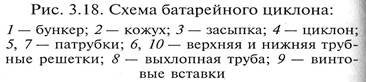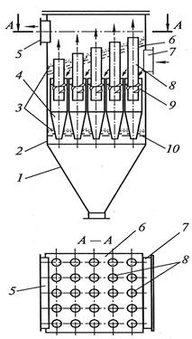 Отсюда следует, что для повышения степени разделения необходимо увеличивать либо скорость потока, что связано с увеличением гидравлического сопротивления, либо уменьшать радиус цилиндрической части циклона, a следовательно, увеличивать их число для обеспечения требуемой объемной производительности по исходной смеси. Для улавливания мелкой пыли (вплоть до 5...10 мкм) применяется батарейный циклон (рис. 3.18), который состоит из циклонов малого (100...250 мм) диаметра (циклонных элементов), работающих параллельно. Размещены они внутри общего кожуха 2, переходящего в общий бункер 1 для сбора пыли из каждого элемента. Все корпуса циклонов 4 установлены в кожухе на нижней трубной решетке 10, а выхлопные трубы 8 – на верхней 6. Для предотвращения перетока эти места уплотняются засыпкой' 3. Ус‑