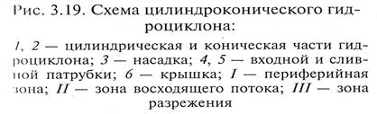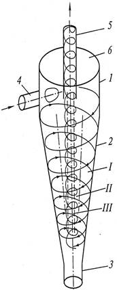 где ζ – коэффициент местного сопротивления; ρг – плотность газа. Для получения определенной производительности V с применением батарейных аппаратов число элементов n в них определяется с учетом объемной производительности каждого из них как n = V/V г '. Для разделения суспензий и эмульсий используются гидроциклоны. Традиционный цилиндроконический гидроциклон (рис. 3.19) представляет собой аппарат, состоящий из цилиндрической 1 с крышкой 6 и конической 2 частей. В цилиндрической части установлен входной патрубок 4, по которому разделяемая смесь тангенциально подается в гидроциклон. Для вывода осветленной жидкости