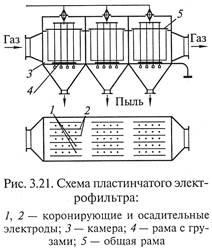 (легкой фазы) служит сливной патрубок 5. В вершине конуса гидроциклона расположена насадка 3 для вывода тяжелой фазы. При тангенциальной подаче исходной смеси, как правило, образуются два основных вращающихся потока жидкости. В периферийной зоне I жидкость движется вниз к вершине конуса. При этом часть ее выходит через насадку 3, основное же количество изменяет направление движения и, образуя внутренний восходящий поток (зона II), поднимается вверх, удаляясь из аппарата через сливной патру6ок 5. При движении внешнего потока к вершине конуса из него выделяется часть жидкости, которая, перемещаясь в радиальном направлении, вливается во внутренний восходящий поток. Обычно напорные гидроциклоны работают со свободным истечением из сливного патрубка 5 и насадки 3, поэтому во время работы через них подсасывается воздух, который вместе с газом, выделившимся из жидкости, образует вдоль оси зону разрежения III (воздушный столб), существенно влияющую на проходное сечение разгрузочных отверстий. Крупные тяжелые частицы отбрасываются к стенкам гидроциклонов, по винтовой траектории перемещаются к насадке 3, откуда и выгружаются. Мелкие легкие частицы концентрируются в восходящем потоке, с которым выносятся через патру6ок 5. Гидроциклоны малых размеров (мультигидроциклоны) объединяют так же, как и газовые, - в батареи. Разделение неоднородных смесей под действием электрического поля Электроочистка применяется для выделения из газовых потоков мелких частиц, которые трудно осадить предыдущими методами. Принцип электроосаждения заключается в ионизации газового потока, содержащего твердые частицы или мелкие капли. Последние при этом приобретают отрицательный электрический за ряд, перемещаются к положительно заряженному электроду и оседают на нем. Ионизация газа может осуществляться самостоятельно – под действием высокой разницы потенциалов на электродах и несамостоятельно – под воздействием излучений (радиоактивного, рентгеновского и др.). В технике газоочистки в настоящее время осуществляют только самостоятельную ионизацию. Основными типами промышленных сухих (для отделения твердых частиц) и мокрых (для отделения капель) электрофильтров в зависимости от формы осадителъного электрода являются трубчатые и пластинчатые. В трубчатом электрофильтре (рис. 3.20) осадительные электроды 3 выполнены в виде цилиндрических или шестигранных (сотовых) труб и соединены внизу с камерой подачи 2, а вверху с камерой 5 отвода очищенного газа. Отрицательно заряженные (коронирующие) электроды 4 в виде проволоки с грузом 11 расположены по осям труб и закреплены в нижней части в решетке 10, препятствующей их колебанию, а в верхней – присоединены к раме 6, подвешенной через изоляторы 7. Осадительные электроды заземлены с помощью устройства 9. Уловленная в сухих электрофильтрах пыль удаляется путем встряхивания с помощью приспособлений 8, в мокрых – стекает в виде пленки и удаляется из бункера 1.