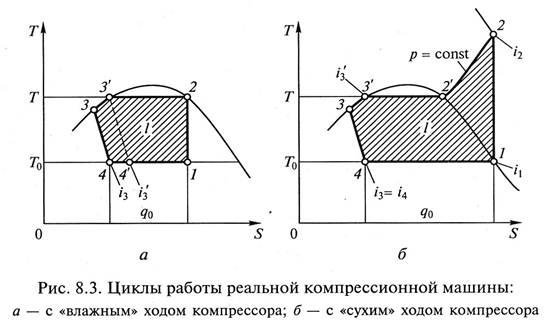 кл с «влажным» ходом компрессора (рис. 8.3, а) наиболее близок к обратному циклу Карно и поэтому обладает наиболее высокой эффективностью. Отличие заключается в том, что процесс дросселирования осуществляется при постоянной энтальпии (изоэнтальпа 3 – 4). Линия 3' – 3 соответствует возможному переохлаждению среды в теплообменнике-конденсаторе. Холодильный коэффициент в этом случае определяется отношением удельной хладопроизводительности в теплоо6менникеиспарителе (i1 – i4) к удельной производительности компрессора (i2 – i1)