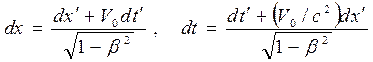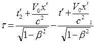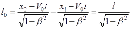1. Сокращение расстояний. Пусть подвижная система перемещается вдоль оси х со скоростью V 0 и в ней находится стержень длиной l 0. В неподвижной системе находится цепочка наблюдателей с синхронизированными часами. Пусть для наблюдателя с координатой х 2 время пролета переднего конца совпало со временем пролета заднего конца мимо наблюдателя с координатой х 1. Подставим в формулу длины стержня