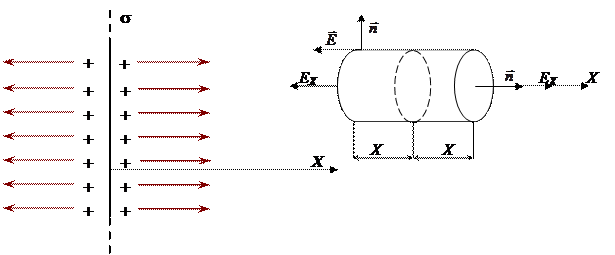 Рис. 2.8. Из симметрии задачи следует, что поле повсюду направлено перпендикулярно к поверхности. Выясним, как меняется напряжённость поля по мере удаления от заряженной плоскости. В качестве гауссовой поверхности удобно выбрать цилиндр. Ось цилиндра направим перпендикулярно плоскости, его основание расположим на расстоянии Х симметрично по обе стороны от поверхности. Вычислим поток вектора напряжённости через боковую поверхность и основания цилиндра. Как следует из рис. 2.8., поток вектора напряжённости Тогда полный поток через замкнутую цилиндрическую поверхность можно записать как поток через два основания цилиндра.