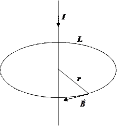 Учитывая симметрию задачи, выберем замкнутый контур в виде окружности радиуса r (рис. 9.12.). Этот контур совпадает с магнитной силовой линией, поэтому циркуляцию вектора посчитать не сложно: