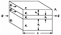 Рис. 1.17. Линейная фильтрация в пласте, состоящем из нескольких изолированных пропластков различной мощности и проницаемости