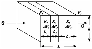 Рис. 1.18. Линейная фильтрация через пласт, имеющий несколько последовательно расположенных зон различной проницаемости
