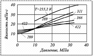 Повышение давления от 0,1 до 1 МПа (рис. 2.4) не влияет на величину вязкости газа, поскольку уменьшение средней длины пробега молекулы и средней скорости движения молекулы компенсируется увеличением плотности. Однако эти закономерности при давлениях выше 3,0 МПа (более 30 атм) изменяются. Газ приближается к области критических давлений и температур и переходит в жидкое состояние. Вязкость жидких систем описывается законом Ньютона и для нее характерны свои закономерности.