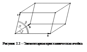 При описании правильной внутренней структуры кристаллов обычно пользуются понятием кристаллической решетки. Кристаллическая решетка представляет собой пространственную сетку, в узлах которой располагаются частицы (атомы, ионы или молекулы), образующие кристалл. В основе кристаллической решетки лежит элементарная кристаллическая ячейка, представляющая собой параллелепипед минимального объема с характерным для данной решетки расположением атомов (рисунок 2.2). Если взять большое число одинаковых кристаллических ячеек и вплотную уложить их в определенном объеме, сохраняя параллельность ребер и граней, то мы будем иметь пример строения идеального монокристалла. Формы кристаллов чрезвычайно разнообразны. Изучением их занимается наука кристаллография.