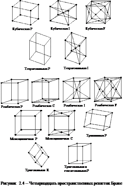 Трансляция действует не на какую-нибудь точку решетки, а на всю решетку в целом. При перемещении решетки на трансляцию в направлении вектора трансляции решетка совмещается сама с собой всеми своими точками. В 1881 г. выдающийся русский кристаллограф Е. С. Федоров исследовал все мыслимые пространственные расположения частиц кристалла, исходя из того, что плотное заполнение пространства кристаллическими ячейками возможно только при определенной форме ячеек, и установил, что внутри 32 классов симметрии может существовать 230 различных пространственных групп (т. е. 230 типов геометрического расположения атомов в кристаллах). Несколько позже E. С. Федорова к таким же результатам пришел немецкий математик А. Шенфлис. Французский кристаллограф О. Браве в 1848 г. положил начало геометрической теории структуры кристаллов и показал, что в зависимости от соотношения величины и взаимной ориентации ребер элементарной кристаллической ячейки может существовать 14 типов кристаллических решеток (они получили название решеток Браве). Различают примитивные (простые), базоцентрированные, объемноцентрированные и гранецентрированные решетки Браве. Если узлы кристаллической решетки расположены только в вершинах параллелепипеда, представляющего собой элементарную ячейку, то такая решетка называется примитивной или простой, если, кроме того, имеются узлы в центре оснований параллелепипеда, то решетка называется базоцентрированной, если есть узел в месте пересечения пространственных диагоналей - решетка называется объемноцентрированной, а если имеются узлы в центре всех боковых граней - гранецентрированной. По форме ячейки в зависимости от углов между ее гранями a, b, g и в зависимости от соотношения между величиной ребер а, b, с различают семь кристаллических систем (сингоний) (см. таблицу 2.1). Приведем примеры элементарных ячеек четырнадцати простейших кристаллических решеток, принадлежащих разным кристаллическим системам (см. рисунок 2.4). На рисунке 2.4 и в таблице 2.1 используются следующие обозначения: P - символ примитивной ячейки, I - объемноцентрированной, F - гранецентрированной, C - с центрированными основаниями, R - ромбоэдрической.