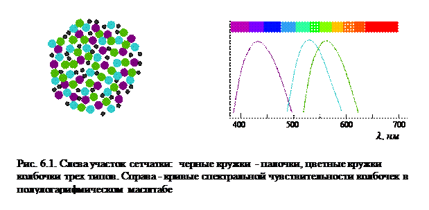 Первая теория трихроматичности предложена в 1802 году английским физиком Томасом Юнгом (1773-1829). По Юнгу в каждой точке сетчатки глаза существуют по меньшей мере три структуры, чувствительные к красному, зеленому и фиолетовому. Эта поразительная догадка была подтверждена экспериментально лишь в 1959 году. Правда, собственные цвета входящих в состав колбочек красителей оказались несколько иными. Кроме того, выяснилось, что каждая колбочка содержит краситель только одного вида. Сетчатка состоит из рецепторов четырех типов: палочек и трех видов колбочек (рис. 6.1). Палочки отвечают за способность видеть при слабом свете и не различают цвета. Палочковый пигмент родопсин представляет собой большую молекулу белка, содержащую группу, называемую ретиненом, которая может отщепляться при поглощении света. Человек не может целиком синтезировать ретинен в собственных клетках, и поэтому должен получать очень похожее вещество с пищей. Это - витамин А, недостаток которого вызывает куриную слепоту, т.е. почти полную потерю способности видеть в темное время суток.