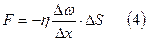 Сила внутреннего трения, возникающая в плоскости соприкосновения двух скользящих относительно друг друга слоев газа, пропорциональна площади их соприкосновения ΔS и градиенту скорости Δω/Δx. Знак минус показывает, что импульс переносится в направлении убывания скорости. Обозначив η – коэффициент пропорциональности внутреннего трения (коэффициент вязкости) Если положить, что ΔS=1м2 и Δω/Δx=-1сек-1, тогда F=η. Коэффициент вязкости численно равен силе внутреннего трения, действующей на 1 м2 площади соприкосновения параллельно движущихся слоев газа при градиенте скорости в -1сек-1. η измеряется в