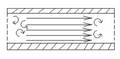 Ламинарный характер течения жидкости (газа) имеет место при небольших скоростях. Когда скорости слоев перемешиваются, такое течение называется турбулентным. Скорость течения по сечению трубы становится почти одинаковой и лишь вблизи ее стенок возникают очень большие градиенты скорости (рис.33)