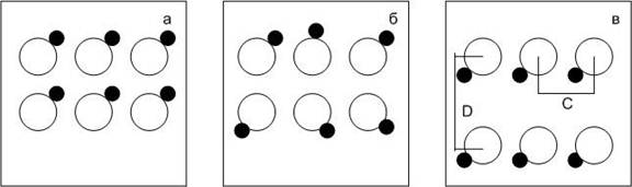 Существуют три класса кристаллических решеток. 1. Координационные решетки (рис.1а) состоят из одинаковых, либо различных элементов, имеющих (решетки ионного типа) или не имеющих (решетки атомного типа) заряд. Примерами решеток такого типа могут служить решетка алмаза (структурных элемент – углерод) и кремнезем (структурные элементы – кислород и кремний). В решетках с различными элементами каждый атом или катион окружены атомами или анионами другого элемента, находящимися в вершинах координационного многогранника. 2. Сложные решетки (рис.1б) состоят из молекул или комплексных ионов, расположенных в узлах кристаллической решетки. 3. Слоистые решетки (рис.1в) образуются при односторонней поляризации, которая приводит к различию в расстоянии между ионами решетки в разных направлениях: С не равно D. Примером могут служить кристаллические решетки слоистых силикатов – талька, гидрослюд, графита.