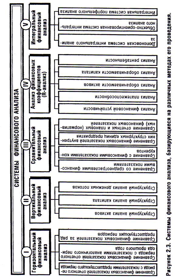 Финансовый анализ представляет собой процесс исследования финансового состояния и основных результатов финансовой деятельности предприятия с целью выявления резервов повышения его рыночной стоимости и обеспечения эффективного развития. Для решения конкретных задач финансового менеджмента применяется ряд специальных систем и методов анализа, позволяющих получить количественную оценку результатов финансовой деятельности в разрезе отдельных ее аспектов, как в статике, так и в динамике. В теории финансового менеджмента в зависимости от используемых методов различают следующие основные системы финансового анализа, проводимого на предприятии: горизонтальный анализ; вертикальный анализ; сравнительный анализ; анализ коэффициентов: интегральный анализ (рис. 2.З.). I. Горизонтальный (или трендовый) финансовый анализ базируется на изучении динамики отдельных финансовых показателей во времени. В процессе использования этой системы анализа рассчитываются темпы роста (прироста) отдельных показателей финансовой отчетности за ряд периодов и определяются общие тенденции их изменения (или тренда). В финансовом менеджменте наибольшее распространение получили следующие виды горизонтального (трен-дового) финансового анализа: