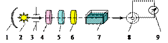 Рис. 4. Схема фотоэлектроколориметра КФК–2ПМ: 1 – рефлектор; 2 – источник света; 3 – диафрагма; 4, 5 и 6 – теплозащитный, нейтральный и цветной светофильтры; 7 – кювета с анализируемым раствором; 8 – фотоэлемент; 9 – микроамперметр