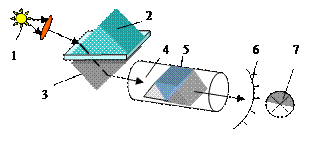 Рис. 5. Принципиальная схема рефрактометра: 1 – источник света; 2 – осветительная призма; 3 – измерительная призма; 4 – зрительная трубка; 5 – призма Амичи; 6 – шкала; 7 – окуляр
