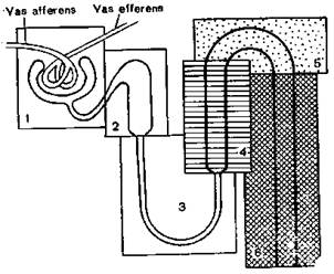 Рис. 27. Функциональная анатомия почек. 1 — клубочек; 2 — проксимальный каналец; 3 — тонкий сегмент петли Генле; 4 — широкая часть петли Генле; 5 — дистальный каналец; 6 — собирательная трубочка