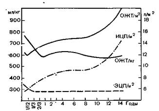 Рис. 111. Жидкость тела в зависимости от массы и поверхности тела, а также возраста. ОЖТ — объем всей жидкости тела; ЭЦП — объем жидкости экстрацеллюлярного пространства; ИЦП — объем жидкости ннтрацеллюлярного пространства (по Bruck et al., 1960). Вода тела, л = [поверхность тела, м2-15,05] — 0,71 М±7,/%. Интересно, что в постнатальном периоде внеклеточное пространство по отношению к поверхности тела остается неизменным, а величина внутриклеточного пространства повышается (рис. 111; по Bruck et al., 1960). Изменения, которые происходят в периоде новорожденности (1 — 10-й день жизни), следует рассматривать особо. Непосредственно после рождения в течение 8 ч жизни (максимум спустя 3 ч) новорожденный (родившийся в срок или преждевременно, теряет в среднем 25% объема плазмы в форме разжиженной плазмы из внутрисосудистого пространства (Clark, Gairdner, Gairdner с соавт.). Вероятно, происходят изменения в бассейне легочной циркуляции. Это ведет к повышению гемоглобина, гематокрита и белков плазмы, т. е. к гемоконцентрации с одновременным сокращением объема циркулирующей крови. Величина индивидуальных колебаний зависит от объема плацентарных трансфузий (Usher с соавт.). За этим плазмотоком (Gairdner с соавт.) следует перемещение жидкости из внутриклеточного к внеклеточному пространству (MacLaurin, Usher с соавт.), благодаря чему объем крови при повышении объема плазмы вновь увеличивается в интервале между 4 и 24 ч жизни. Такой процесс наблюдается вплоть до третьего дня жизни, ведет к временной внутриклеточной дегидратации (MacLaurin) и является выражением нестабильности водного баланса, особенно во внутриклеточном пространстве. Экспансией внеклеточного пространства можно объяснить образоваие отеков у новорожденных. Особенно подвержены этому недоношенные дети. Как нормальные показатели электролитов в организме в целом, так и их распределение в плазме, свойственные взрослому организму, нельзя без ограничений переносить на детский возраст, в частности на период новорожденности и младенчества. В пересчете на массу тела новорожденные содержат почти на 50% больше натрия и на 20% меньше калия, чем взрослые (Wilkinson). Соответственно коэффициент Na: К у новорожденных выше, чем у взрослых (1,5 против 0,6). Этот факт объясняется главным образом различной величиной вне-и внутриклеточного пространства. Отмечаются также колебания содержания и других ионов. Недоношенные дети обладают особенно большим количеством натрия и хлоридов из-за относительно большего внеклеточного пространства (Widdowson, Widdowson, Spray). Также «нормальные значения» электролитов плазмы, свойственные взрослым, нельзя переносить на детей раннего грудного возраста до первого месяца жизни (Acharya, Payne) [Thalme, 1962; Thalme, 1964] (Widdowson, McCance, Ju с соавт.). Натрий: концентрация натрия в крови из вены пупочного канатика достигает 147 мэкв/л плазмы, а в течение первых 12 ч падает до значений нормы у взрослых и повышается в течение следующих дней жизни снова до уровня 148 мэкв/л; лишь после периода новорожденности она достигает нормальных пределов. Падение в первые часы жизни объясняется, вероятно, перемещением воды из внутриклеточного во внеклеточное пространство. Более позднее повышение концентрации натрия является выражением физиологической гиперосмолярности в течение периода новорожденности [Gautier, 1964] и объясняется преимущественно недостаточной концентрационной 
