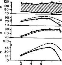 8 Ю Месяцы беременности * Рис. 128. Влияние положения на боку и на спине на показатели сердечно-сосудистой системы при беременности (по Bonica). а — артериальное давление (мм рт. ст.); б — ударный объем (мл); в — частота сердечных сокращений (мин); г —изменение минутного объема сердца (%). Сплошные кривые — положение на спине, прерывистые — на боку.