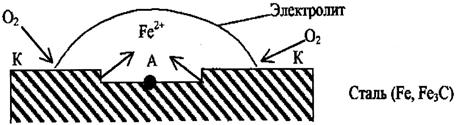 А: Fе° - 2е К: О2 + 4е + 2Н2О В центре капли, куда доступ кислорода мал, разрушается сам металл (становится эта часть поверхности анодом). По периферии, где проникновение О2 будет большим, он адсорбируется на поверхности металла и защищает его от действия электролита.