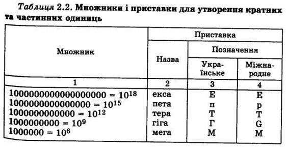 Найпрогресивнішим способом утворення кратних та частинних одиниць є прийнята у метричній системі мір десяткова кратність між великими і малими одиницями. Десяткові кратні та частинні одиниці від одиниць СІ утворюються шляхом використання множників та приставок від 10+18 до 10-24 (табл. 2.2).