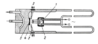 Схема рентгенівської трубки: 1- нитка катоду; 2 – фокусуючий ковпачок; 3 – вікно для випуску рентгенівсткх променів; 4 – захисний циліндр; 5 – дзеркало аноду.