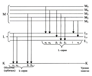 Трішки детальніше зупинимося на процесі формування рентгенівського випромінювання при взаємодії вихідного електронного пучка і зразку, оскільки це рентгенівське випромінювання лежить в основі ряду практично важливих і найбільш широко поширених методів аналізу речовини. Швидкі електрони пучка зіштовхуючись з атомами зразку можуть вибити електрони із внутрішніх орбіталей атомів, при цьому атом переходить у збуджений стан і повинен через деякий час повернутися в основний стан. Перехід в основний стан здійснюється шляхом «скидання» зовнішніх електронів на вільні низько розміщені рівні в атомі, що приводить до випускання квантів рентгенівського випромінювання. При цьому спостерігають так звані серії рентгенівських ліній.