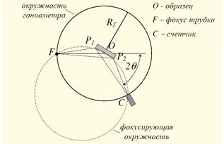 Присторої, які використовуються для одержання таких рентгенограм називають дифрактометрами. Основними вузлами дифрактометра є оперативний столик, на якому розміщені пульт керування, рентгенівська трубка у захисному кожусі, гоніометричний пристрій для встановлення та вимірювання кутів, лічильник квантів і окремо розміщений блок електроніки. Пучок рентгенівських променів, які виходить із рентгенівської трубки проходять через систему щілин, які обмежують його вертикальне і горизонтальне розходження, і падає на зразок. Розсіяні зразком промені проходять через другу систему щілин і потрапляють у лічильник. Виникає питання: чому рентгенівські дифрактограми зображують у координатах інтенсивність - 2θ, а не інтенсивність - θ. Причина полягає у використаній системі фокусування поменів. При роботі на дифрактометрах необхідно використовувати фокусуючу геометрію зйомки. Частіше всього для фокусування використовується метод Брега-Брентано, в якому плоский зразок розміщується так, щоб його поверхня знаходилася на осі О обертання гоніометру. Фокусування за Брегом-Брентано базується на рівності вписаних кутів, які впираються у одну і ту ж дугу: фокус рентгенівської трубки F, поверхня зразку P і приймаюча щілина S повинні знаходитися на одній окружності – окружності фокусування 1. Для збереження умов фокусування при автоматичній реєстрації кутова швидкість руху лічильника повинна бути вдвічі більшою швидкості руху зразку. Тобто зразок і лічильний синхронно рухаються із співвідношенням кутових швидкостей 1:2. Саме це і пояснює той факт, що рентгенівські дифрактограми зображують у координатах інтенсивність - 2θ. Таким чином зразок і лічильник рухаються автоматично в одній площині навколо спільної осі гоніометра із співвідношенням швидкостей Vліч.=2Vзразку. При цьому лічильник вимірює інтенсивність дифракційної картини послідовно під різними кутами відбиття. В результаті тим чи іншим чином фіксується крива залежності інтенсивності дифракційної картини від кута відбиття – дифрактограма.